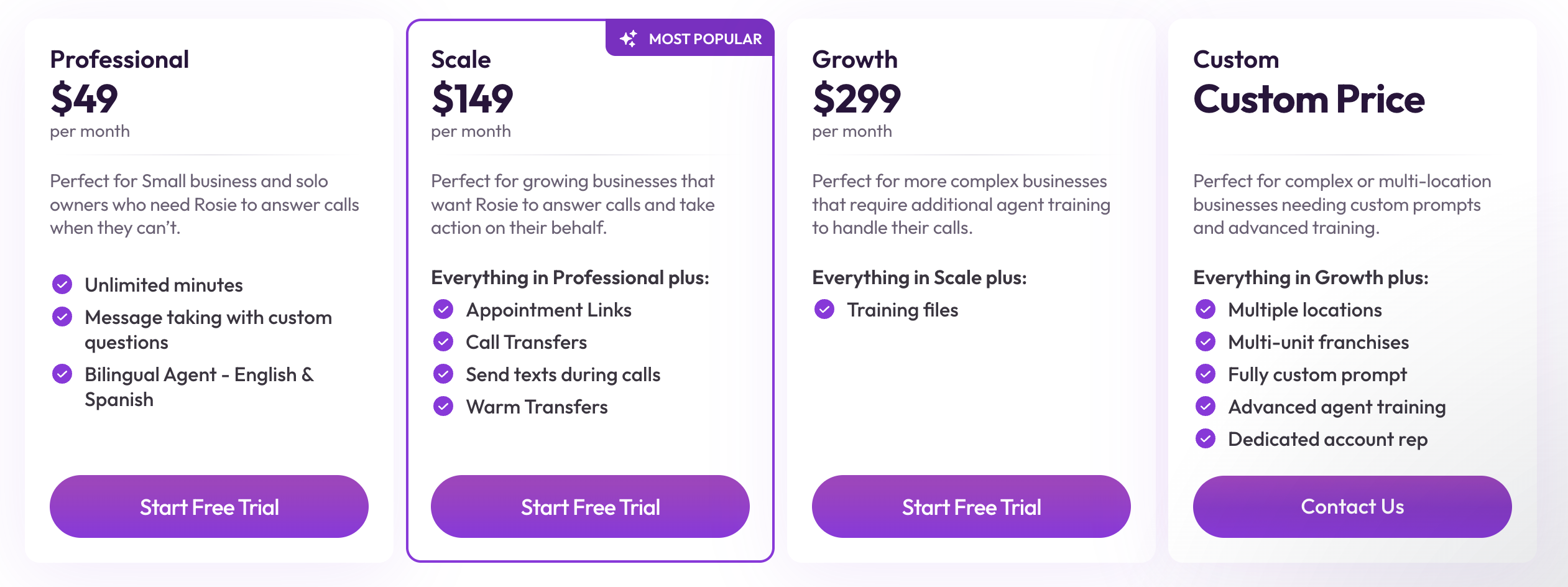 All plans include unlimited minutes and message taking, and Rosie offers a 7-day free trial.
