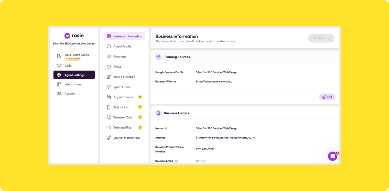 - Learns from your existing assets: Rosie scans your website and Google Business Profile to train its AI.