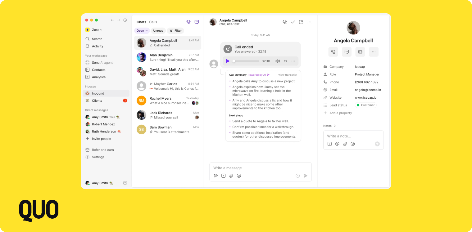 Quo's standout feature is its collaboration-first design. A shared inbox where team members can see, tag, and comment on calls and messages makes it genuinely easy for small teams to stay aligned without a dedicated CRM. The UI is consistently praised for being clean and intuitive — it doesn't feel like you need an IT department to configure it. Sona, the AI answering service, handles inbound calls intelligently, and the Business plan includes AI call summaries and transcripts in 34 languages.