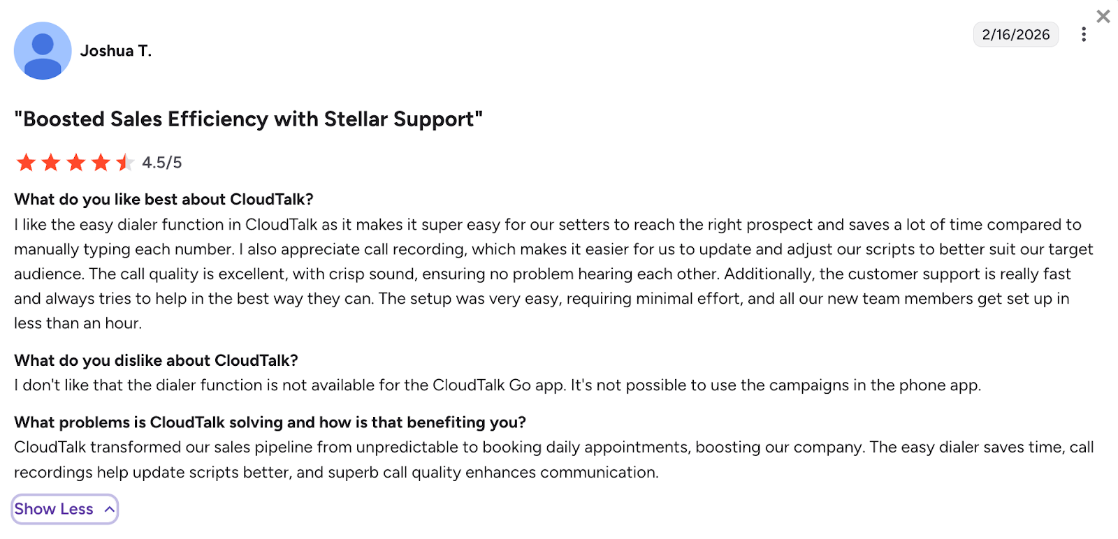 There's no minimum user requirement, which means a solo freelance setter can sign up, get a number, and start calling within minutes. No contracts, no onboarding calls, no IT setup.