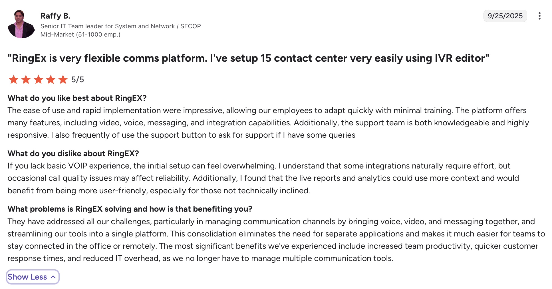 RingCentral on G2 has a score of 4.1 out of 5, and it’s praised for its ease of use, rapid implementation, and feature depth.