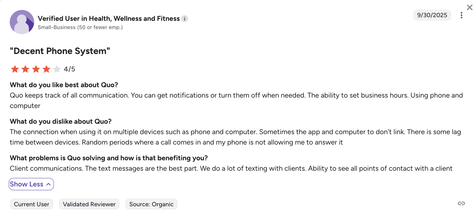Quo on G2 has a score of 4.7 out of 5, it’s praised for its ease of setup, clean mobile app, and team collaboration features. Users highlight shared inboxes and integrations as game-changers for small sales teams.