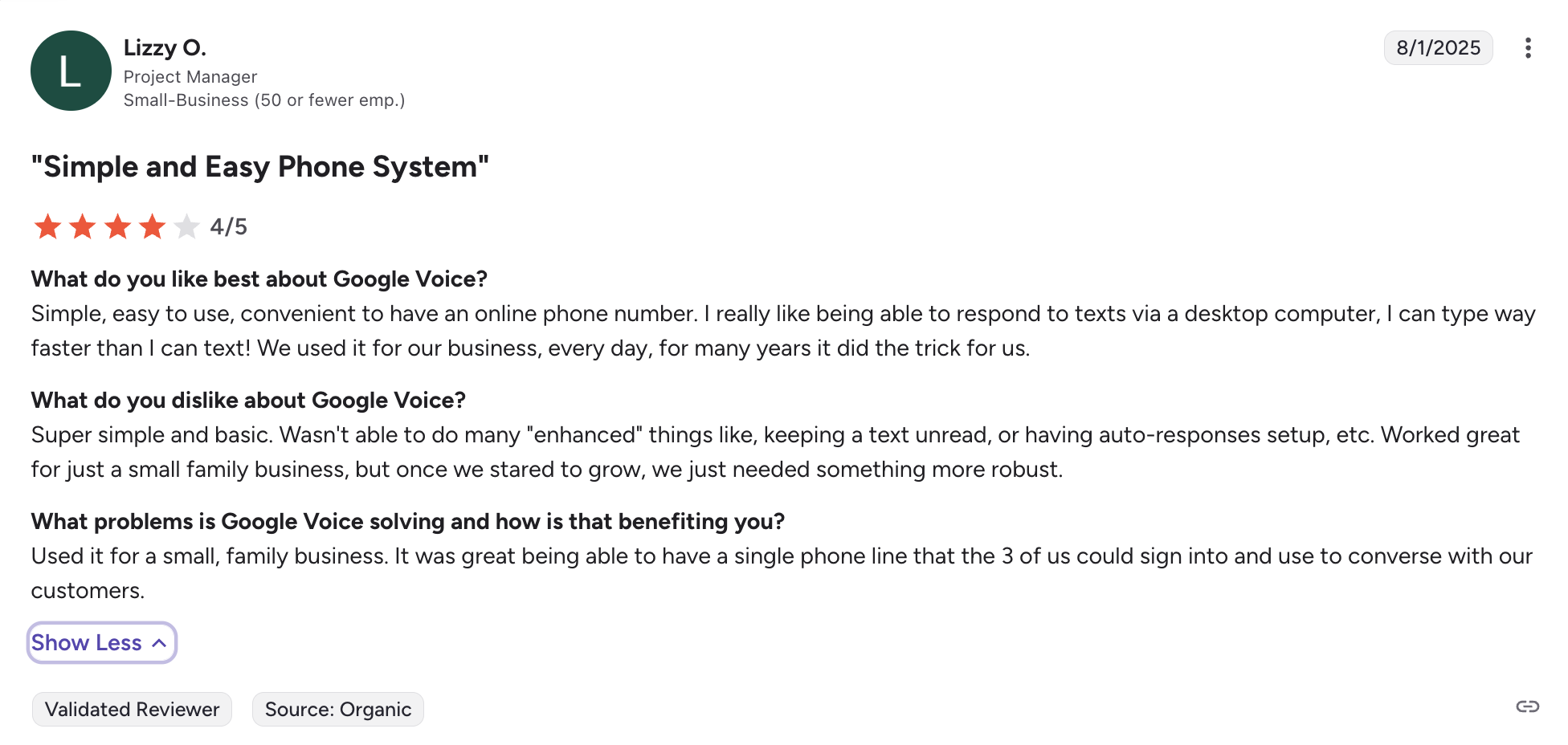 Google Voice on G2 has a score of 4.1 out of 5, and a lot of users comment about its low cost, simplicity, and seamless integration with Google apps. Criticism mostly revolves around limited business features and weaker support.