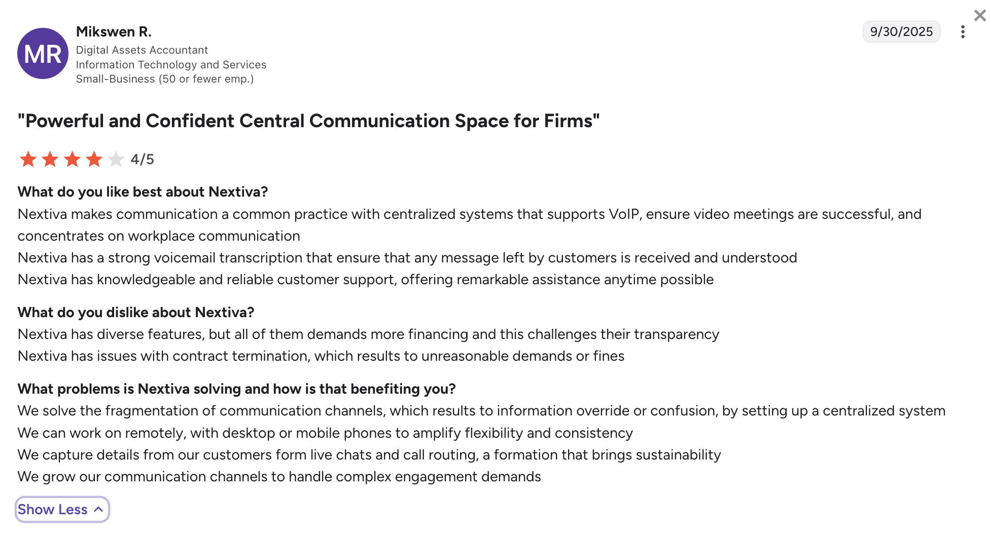 Nextiva on G2 has a score of 4.5 out of 5. It is praised for its call quality, reliability, and strong support. Customers especially value its advanced call center features and integrations. Some note that the UI feels dated compared to lighter apps like OpenPhone or Allo, and cancelling the service can be complicated and time-consuming.