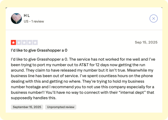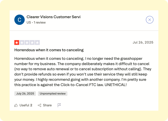 - Grasshopper on the other hand, has a score of 2 out of 5 on Trustpilot with frequent complaints about billing, cancellations, and unhelpful support.