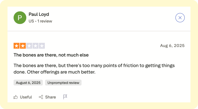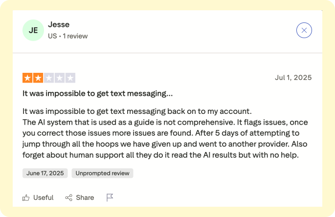 - The product feels clunky. A customer wrote: “It was impossible to get text messaging back on to my account. The AI system flags issues, and once you correct those, more issues are found.”