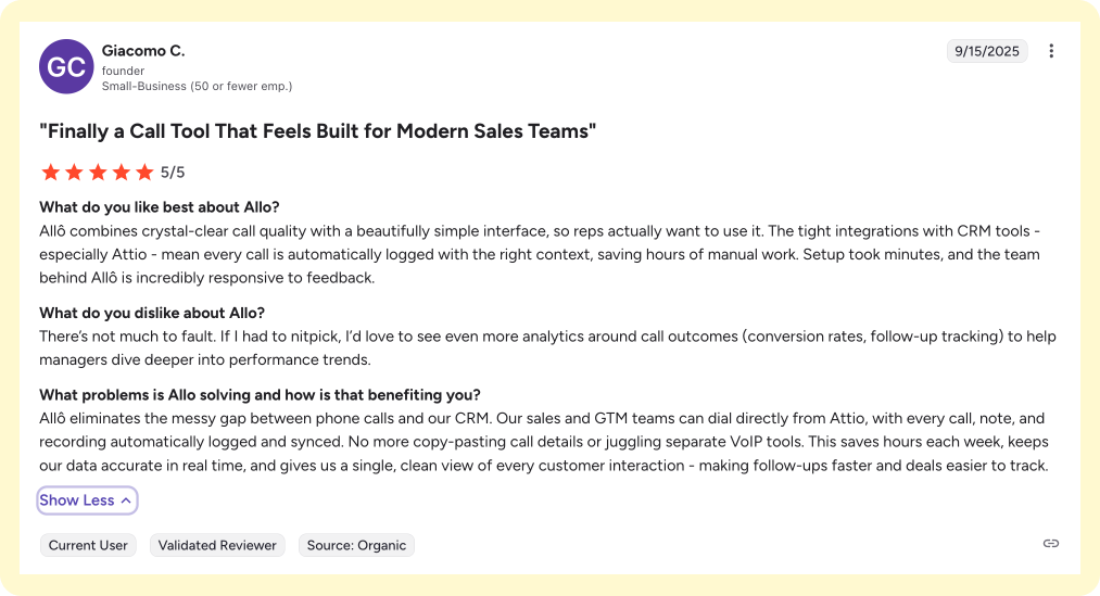 Allo on G2 has an excellent score of 4.9 out of 5, and it’s praised for ease of use, call quality, and AI features.