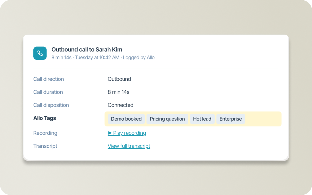 Each tag has its own prompt. After the call ends, Allo reads the transcript and checks every prompt. If it matches, the tag is applied. No reps forget. No CRM drift.