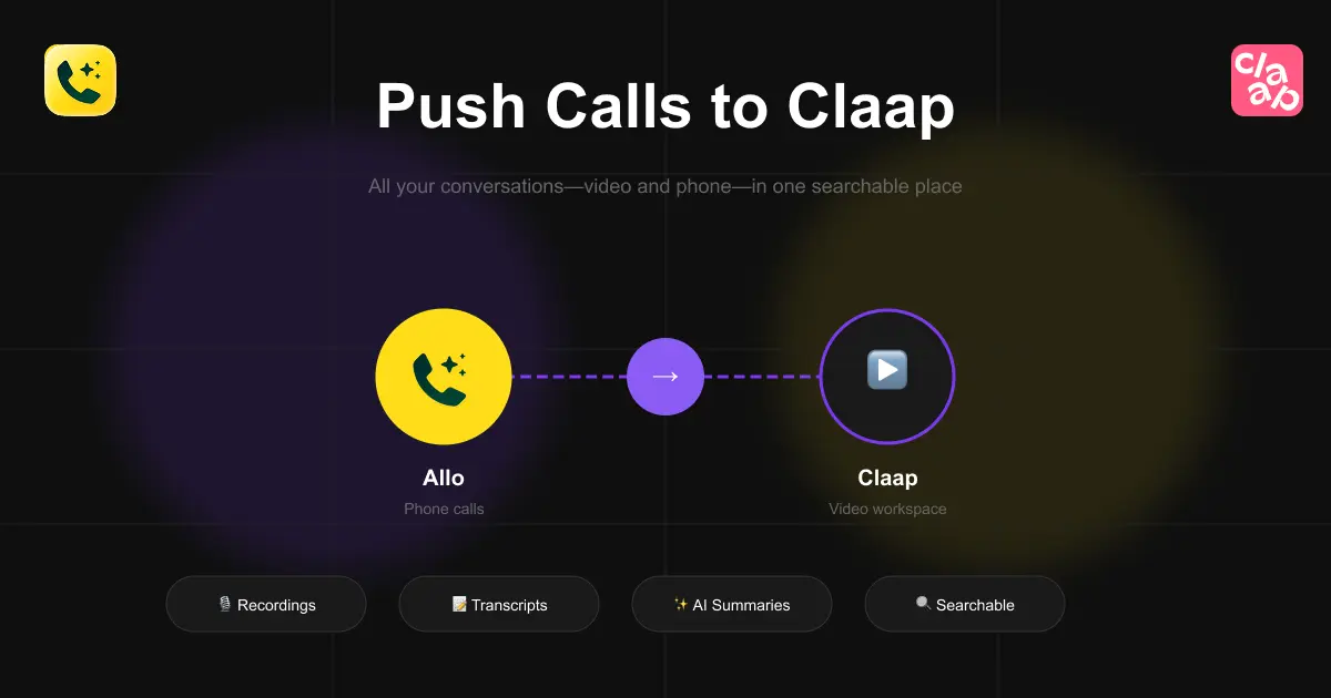 Combine Allo's phone intelligence with Claap's video workspace for a complete conversation library.