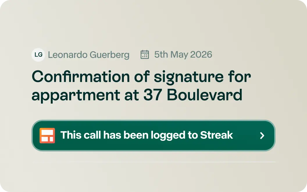 Calls, transcripts, summaries sync automatically into Streak's Gmail sidebar. Your pipeline stays clean.